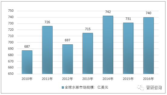 由于市場需求與價格的變動,近年來全球水泵產業市場規模呈現一定的波動性,2016年全球水泵產業市場規模達740億美元,較2015年的731億美元增長1.24%。